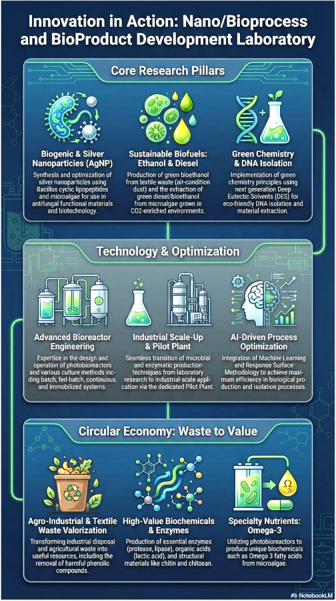 Various studies are carried out by using nanobioprocess technology that processes using microorganisms to obtain a product that can serve the different needs of today. In addition, the design and operation of different bioreactors, preparation of bioreactors for production, conversion of industrial wastes into value-added products, using batch, fed-batch, continuous culture production methods, immobilization applications, microbial and enzymatic production techniques and optimization of separation and purification are conducted. Scale up processes and industrial production are also applied at Pilot Plant.